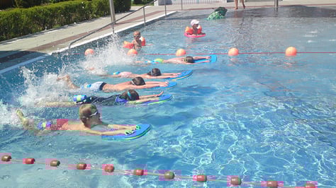 Mitzubringen sind: Schwimmbrille, Badehaube und Schwimmbrett